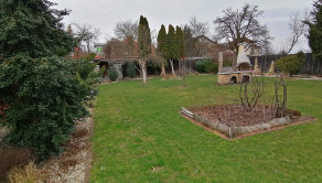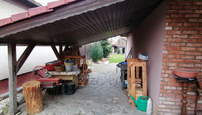 Garáž je priestranná a zmestí sa sem aj väčšie auto. 1. prístrešok je pred garážou a vstupnými dverami. 2. prístrešok je vedľa garáže a je vhodné na parkovanie ďalšieho vozidla. 3. prístrešok je za domom a slúži na terasové sedenie s výhľadom na okrasnú záhradu, ktorej dominuje centrálne umiestnený vonkajší krb na grilovanie. Nachádza sa tu aj studňa, ktorá je využívaná na zavlažovanie záhrady.