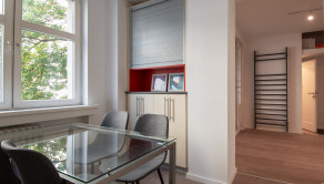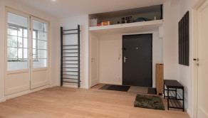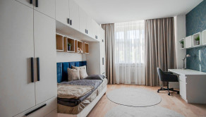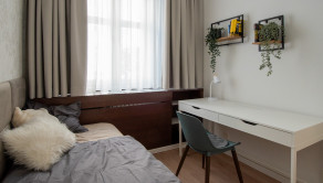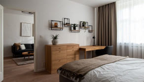 Tento zrekonštruovaný byt ponúka premyslenú dispozíciu, ktorá spája komfort s funkčnosťou. Vstupuje sa do priestrannej chodby, z ktorej je prístup do samostatnej toalety, kúpeľne so sprchovým kútom a práčkou, ako aj do loggie orientovanej do tichého vnútrobloku. Kuchyňa je plne vybavená modernými spotrebičmi a doplnená jedálenským kútom, pričom sa cez ňu prechádza do menšej obytnej izby so vstavanou skriňou, stolom a posteľou – ideálna ako pracovňa či hosťovská miestnosť. Pri kuchyni sa nachádza praktická samostatná špajza s množstvom uložneho priestoru. Z predsiene sa vchádza do veľkej samostatnej izby s posteľou, pracovným stolom a úložným priestorom. Obývacia izba je zariadená pohodlným gaučom, TV stenou a konferenčným stolíkom a plynule nadväzuje na hlavnú spálňu s manželskou posteľou, komodou a vstavanou skriňou. Byt je kompletne zrekonštruovaný, vybavený novými, nepoužívanými spotrebičmi a špeciálnymi oknami, ktoré účinne eliminujú mestský ruch a plne klimatizovaný.