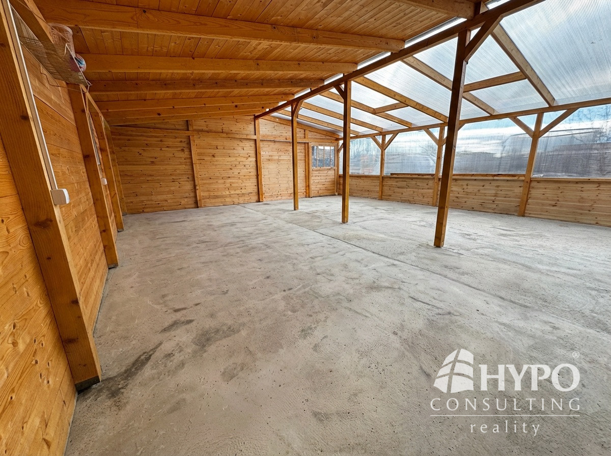 Vzadu za domom je veľká priestranná terasa, ktorá sa na zimu uzatvára lexanom, v lete je príjemne otvorená. Jej veľkosť umožňuje aby tu okrem sedenia bola napríklad výrivka, prípadne sauna. Za terasou sa nachádza záhradný domček.