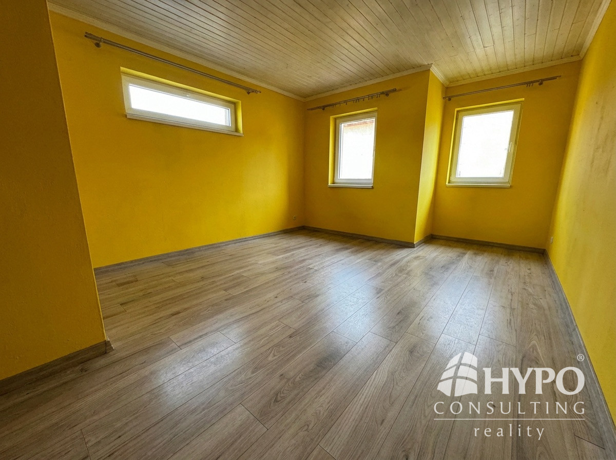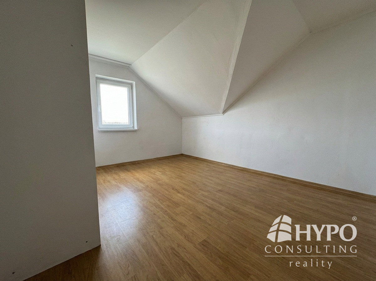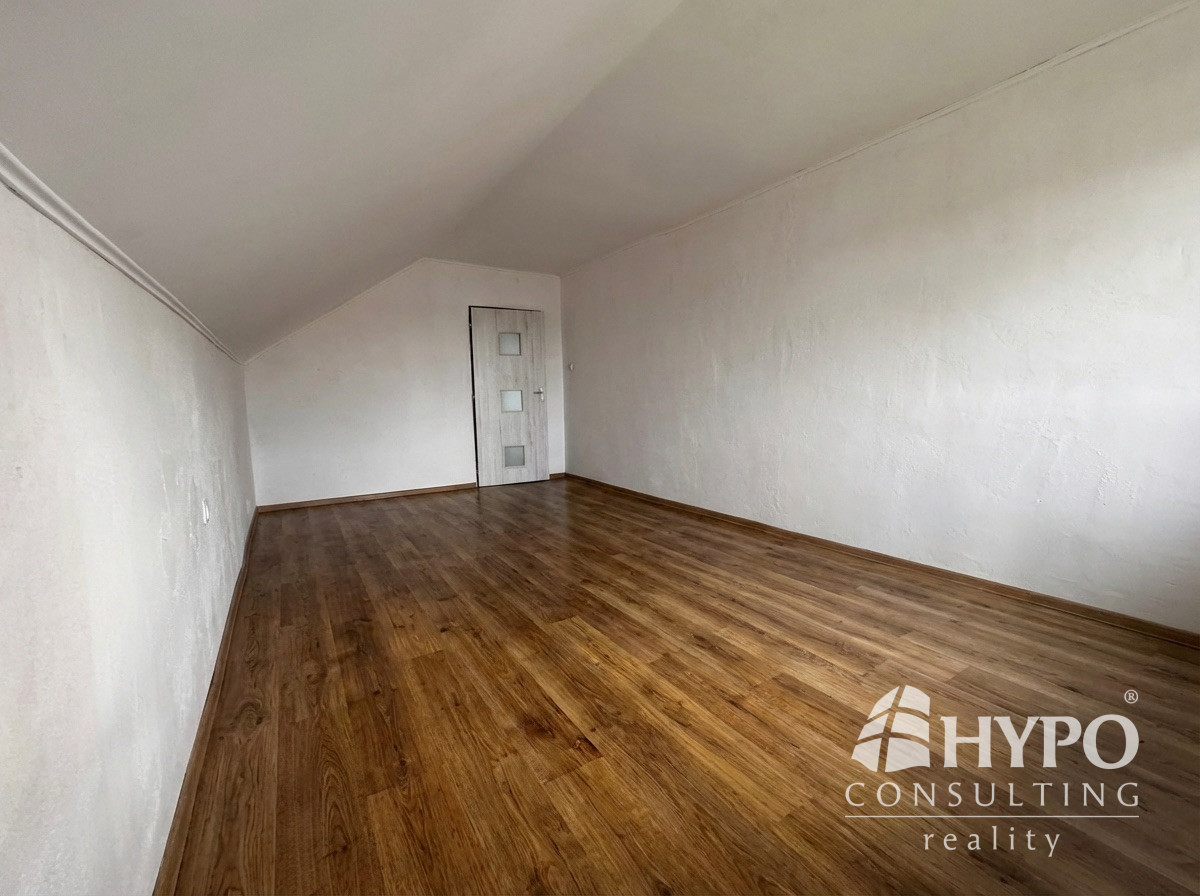 Na poschodí sa nachádzajú štyri izby, z toho jedna je väčšia a je tu možnosť mať kuchyňu s jedálňou alebo obývačkou. Je tu aj kúpeľňa s wc a šatník. To umožňuje do budúcna vytvoriť z tohoto domu dve bytové jednotky. Tri izby majú balkón. Tu sa nachádzajú radiátory.