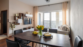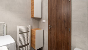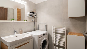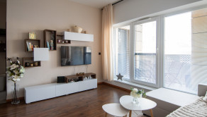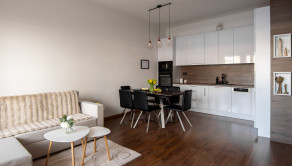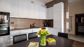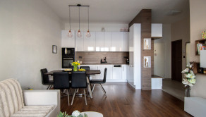 Apartmán je kompletne dizajnovo zariadený s citom pre detail, majiteľka si dala záležať na kvalitných materiáloch aj funkčnosti priestoru. Kuchynská linka je vyrobená na mieru, byt pôsobí harmonicky a veľmi príjemne.